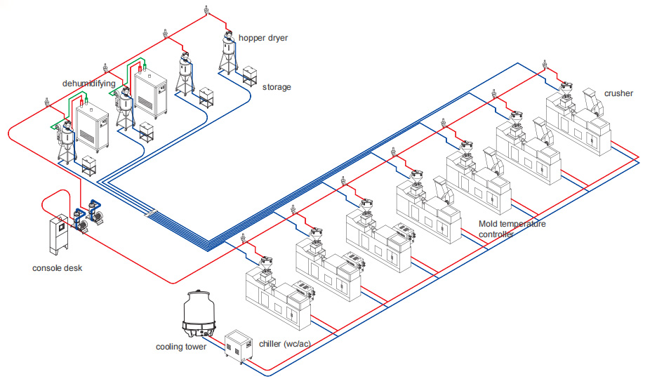 · 中央控制台采用国外先进PLC控制,通过程序控制显示每台注塑机的吸料、开机、缺料报警等操作;